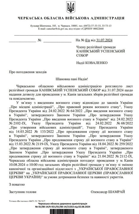 On August 10 at 10:00 AM, activists from the Orthodox Church of Ukraine (OCU) plan to launch a church raid of the St. George's Cathedral of the Ukrainian Orthodox Church (UOC) in Kaniv. According to the Dozor_kozak1 Telegram channel, the Cherkasy Regional State Administration has granted permission to hold a meeting, allegedly on behalf of the UOC religious community.