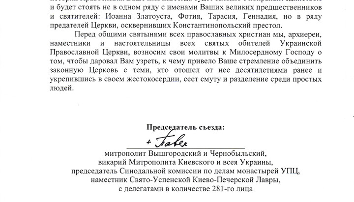 Before the common shrines of all Orthodox Christians, we, the bishops, abbots, and abbesses of all the holy monasteries of the Ukrainian Orthodox Church, offer our prayers to the Merciful Lord to grant you to see what your desire to unite the legitimate Church with those who fell from it decades earlier and strengthened in their hardheartedness, sowing confusion and division among ordinary people, has led to.