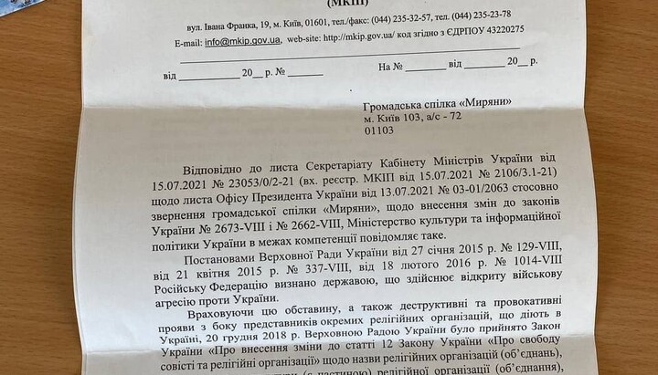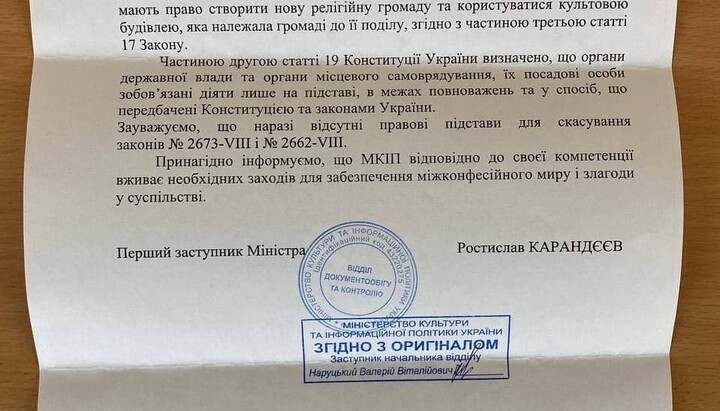 “And so we received a response from the Cabinet of Ministers signed by First Deputy Minister of Culture and Information Policy Rostislav Karandeev. The crux of the answer is that the Cabinet of Ministers openly defended the discriminatory anti-church laws, justifying the forced renaming of the Ukrainian Orthodox Church and the seizure of its temples,” the “Miriane” reported.
