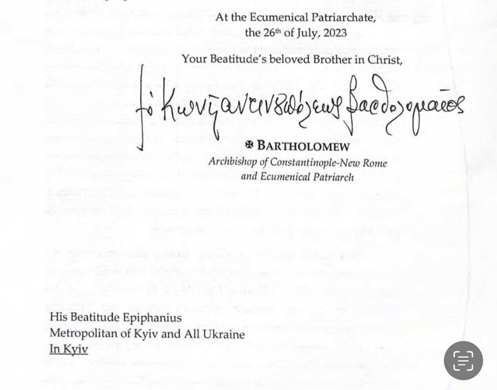 On September 1, a publication close to the OCU released an unofficial translation of a letter dated July 26, 2023, from Ecumenical Patriarch Bartholomew, in which he warned Epifaniy (Dumenko) against actions that could create the impression that he is trying to maintain the church schism in Ukraine.