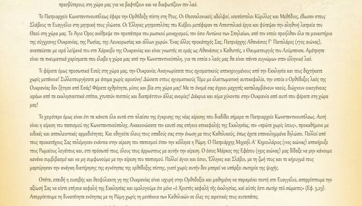 In this document, believers described in detail what the Tomos, granted by the head of Phanar to the schismatics, actually brought to the Orthodox of Ukraine, and called on Patriarch Bartholomew to admonish and repent “for the encroachment on the leadership in the Church, which belongs solely to our Lord Jesus Christ, for the desire to unite with the Catholics, for the recognition of Ukrainian schismatics, for the seizure of our churches, for the beating of our believers, for the enmity and hatred that you brought to our land!"
