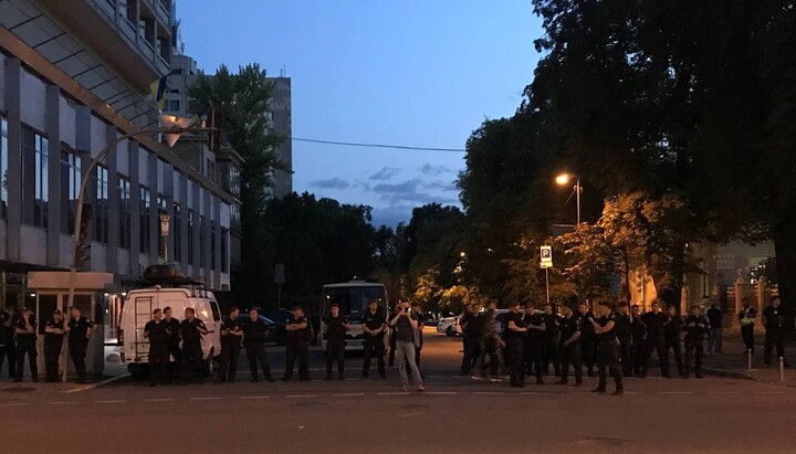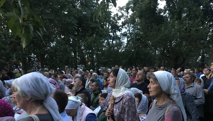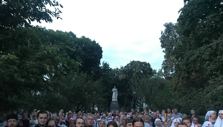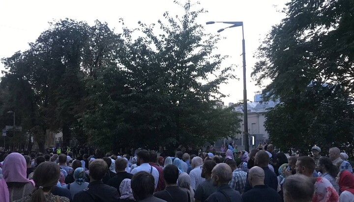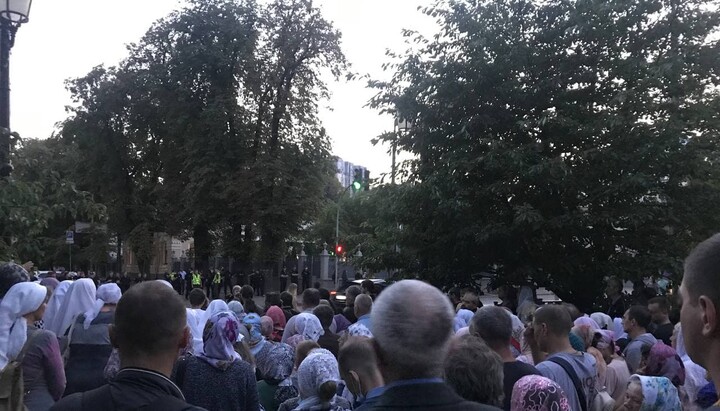 About half a thousand believers with portraits of His Beatitude Metropolitan Onuphry are holding a prayer standing in front of the residence of Patriarch Bartholomew in Kyiv. The police did not allow them directly to the residence on Lypska Street, hence believers are located in the park near the monument to Vatutin. The event is broadcast live by the 1Kozak channel. At about 20.00, the believers began singing the akathist to the Mother of God.