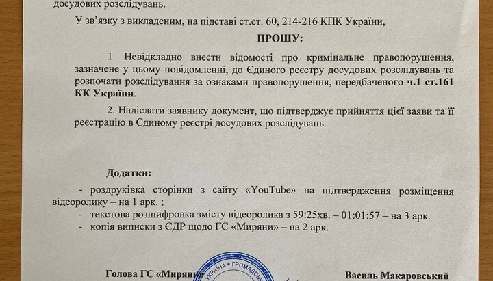 The public union "Miriane" has prepared a report to the police about the crime, committed by journalist Muzhdabaev under Article 161 of the Criminal Code of Ukraine. The corresponding document was published in the organization's tg-channel on Tuesday, September 14, 2021.