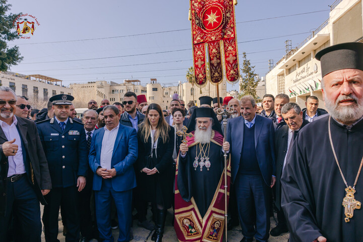At the monastery, His Beatitude was greeted by representatives of the Bethlehem community, the Shepherds' Village, Beit Jala, and Israel’s Ministry of the Interior. From there, the Jerusalem Patriarch, escorted by riders from the Israeli military command, traveled to the Rachel’s Tomb border checkpoint. He was then received by representatives of the Palestinian Authority, who transported him in their vehicles to Bethlehem's central square.