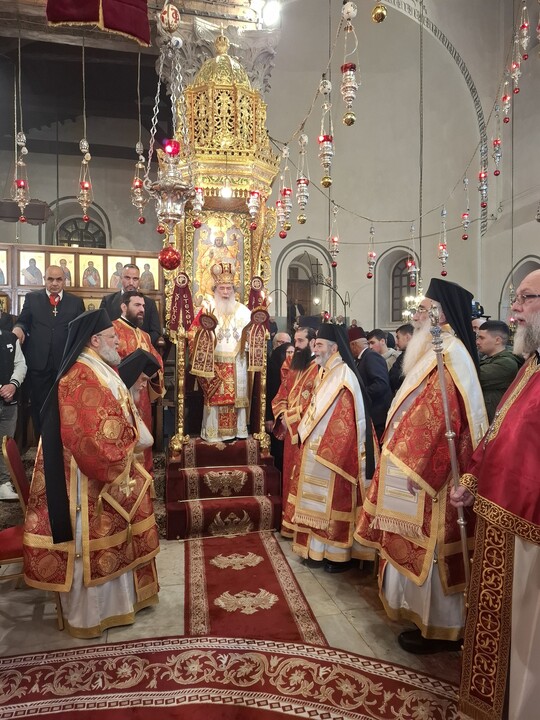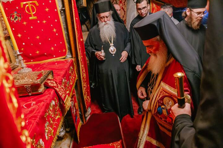 The procession then exited through the northern gate of the Grotto, and in the Catholicon, the reading of the Royal Hours of the Nativity, Vespers, and the Divine Liturgy of St. Basil the Great began, with His Beatitude presiding.