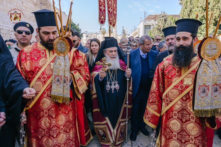 At this point, His Beatitude was addressed by Patriarchal Vicar of Bethlehem, Metropolitan Benedict of Diocaesarea. The procession began through the courtyard of the Basilica of the Nativity, led by hierarchs and clergy singing "Thy Nativity, O Christ our God."