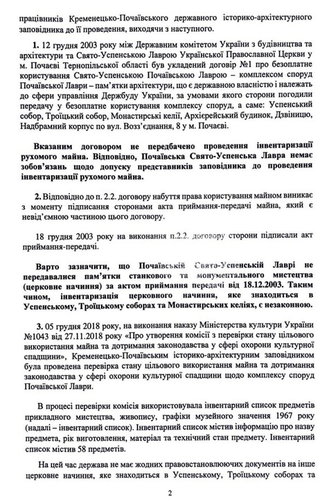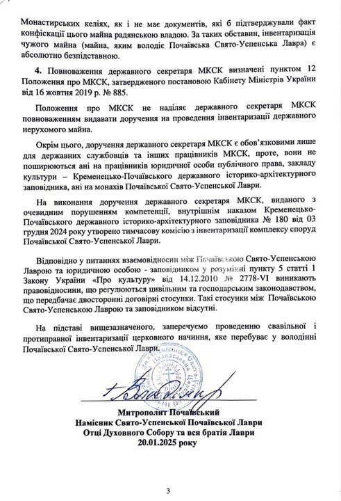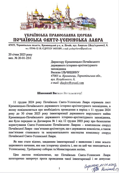 Shërbimi i shtypit i Lavrës së Pochayiv të Fjetjes së Shenjtë doli me një deklaratë shprehëse të mosmarrëveshjes së tyre me inventarin e pronës që u nis nga Rezervati Historik dhe Arkitektural Shtetëror i Kremenets-Pochayiv. Sipas një letre nga rezervati, inventari ishte i planifikuar të zhvillohej nga 11 Dhjetor 2024 deri më 30 Janar 2025. Megjithatë, Lavra argumenton se veprimet e tilla janë të paligjshme.