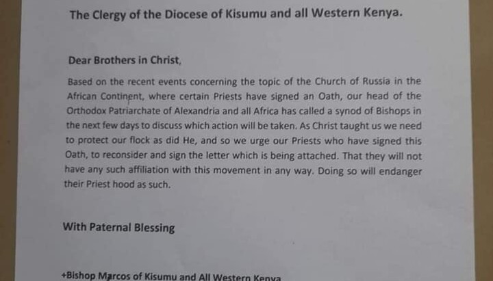 “We urge our Priests who have signed this Oath to reconsider their decision and sign the letter which is being attached. That they will not have any such affiliation with this movement (to the jurisdiction of the Russian Church – Ed.) in any way. Doing so will endanger their Priesthood as such," a letter of Bishop Marcos of Kisumu and All Western Kenya says.
