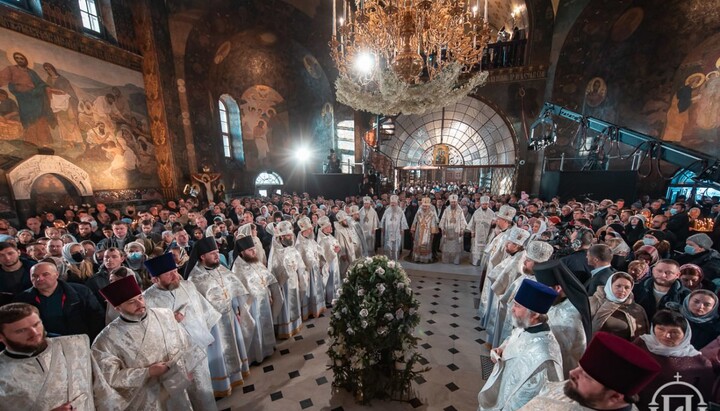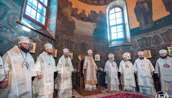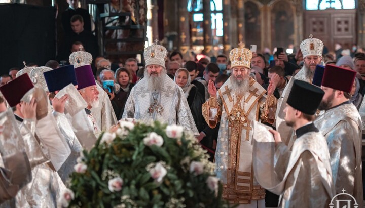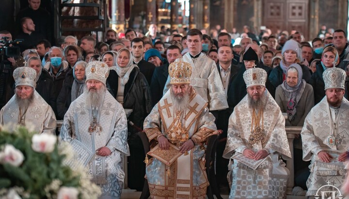 The Primate of the UOC was concelebrated by the abbot of the Kyiv-Pechersk Lavra, Metropolitan Pavel of Vyshgorod and Chernobyl, the UOC Chancellor, Metropolitan Anthony of Boryspil and Brovary, Archbishop Panteleimon of Bucha, Bishop Victor of Baryshevka, Bishop Sylvester of Bilogorodka Bishop Laurus of Irpen, Bishop Mark of Borodianka and the clergy of the monastery.