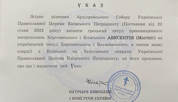 On January 22, members of the "synod" of the UOC-KP changed Auxentios Marines’ title from "Chersonesus and Aegina" to "Chersonesus and Volnovakha".