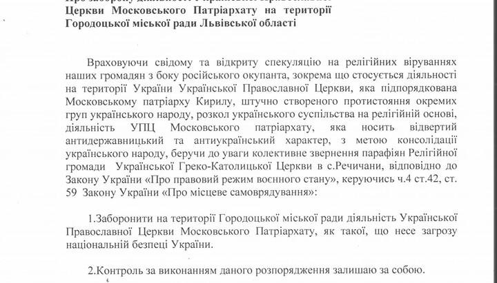 On February 28, 2022, the head of the Horodok City Council in the Lviv region, Volodymyr Remeniak, published an official order on his Facebook page “On the prohibition of the activities of the UOC of the Moscow Patriarchate”.