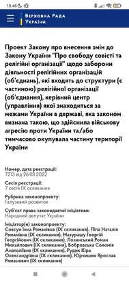 The Verkhovna Rada registered another draft law No. 7213 on the prohibition of the UOC dated March 26, 2022, on amendments to the Law of Ukraine “On Freedom of Conscience and Religious Organizations”.