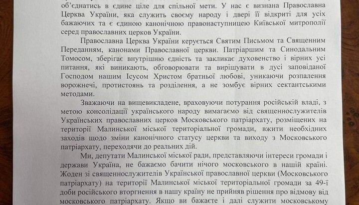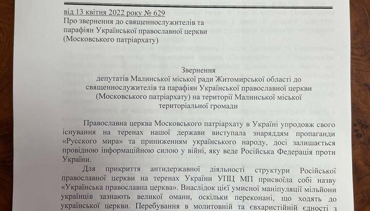"None of the clergymen of the Ukrainian Orthodox Church on the territory of the Malyn city territorial community has decided to abandon the Moscow Patriarchate on the 49th day of the Russian invasion of our country. If you want to continue serving the Moscow Patriarchate, we demand that within 24 hours you vacate the churches belonging to the Ukrainian people," the Malyn MPs said in their decision.