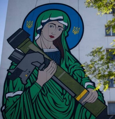 The pictures of the mural show the outline of a woman with a halo, with a trident depicted inside. She is holding an American Javelin man-portable anti-tank missile system designed to hit armoured vehicles and low-velocity, low-flying targets.