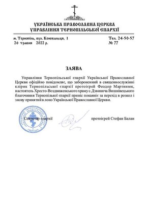 “The administration of the Ternopil diocese of the Ukrainian Orthodox Church officially announces that Archpriest Theodore Martyniuk, the cleric of the Ternopil diocese, rector of the Exaltation of the Cross Church of vlg Dzvyniach of the Vyshnevets deanery of the Ternopil diocese, who was banned from the priesthood, repented for backsliding into schism and was again accepted into the bosom of the Ukrainian Orthodox Church,” the statement says.