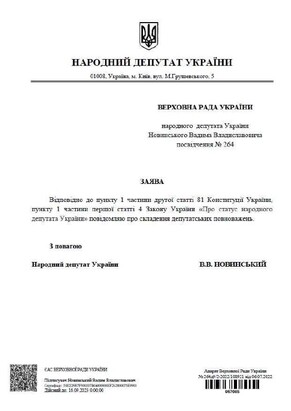 "I have decided to resign as a people's deputy of Ukraine to focus on humanitarian projects, the development of the national economy, the service to the Ukrainian Orthodox Church and the restoration of destroyed churches. I will pay special attention to projects of post-war economic revival of Ukraine as an industrial, high-tech and highly educated country," Vadim Novinsky wrote.