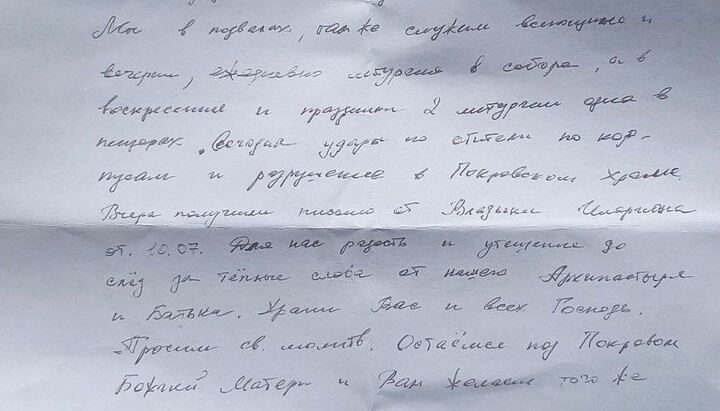 "We are in the basements, we serve all-night services and vespers there, we serve liturgies daily in the cathedral, and 2 liturgies on Sundays and holidays, one in the caves. Today there were attacks on the monastery and buildings, which resulted in the destruction of the Intercession church," the bishop wrote. He reported he had received a letter from Vladyka Hilarion on July 10 and called the archpastor's warm words "joy and consolation to the point of tears."