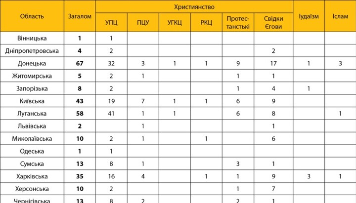 Of the 270 buildings damaged, 30 belong to Protestant communities, 21 to the Orthodox Church of Ukraine, 4 to the Roman Catholic Church, 3 to the Ukrainian Greek Catholic Church, 66 to Jehovah's Witness communities, and the rest to the Ukrainian Orthodox Church.
