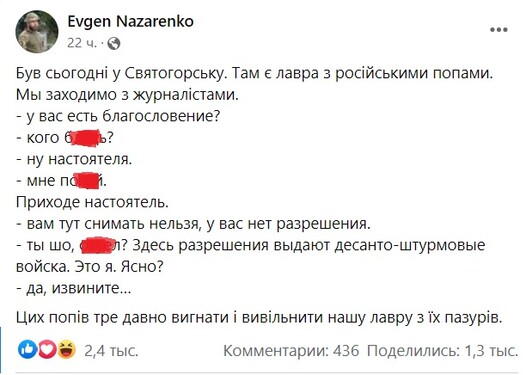 On September 28, 2022, Ukrainian journalist Yevhen Nazarenko, who works for the Ukrainian Witness, spoke about visiting the Sviatogorsk Lavra, where, according to him, “Russian priests serve.” He wrote about this on his Facebook page.